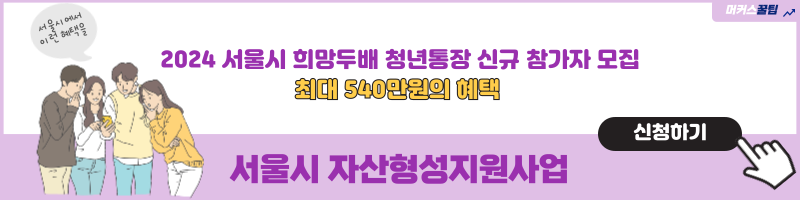 서울시에서 일하는 청년들의 희망찬 미래를 준비할 수 있도록 자산형성에 도움을 주는 희망두배 청년통장을 지원합니다. 3년간 15만원씩 적립하면 최대 540만원의 혜택을 받으실 수 있으니 놓치지 말고 신청하시기 바랍니다. 선발인원이 10,000명으로 많지 않으니 놓지지 말고 바로 신청하시면 됩니다. 빠른 신청은 아래 버튼에서 확인할 수 있습니다.